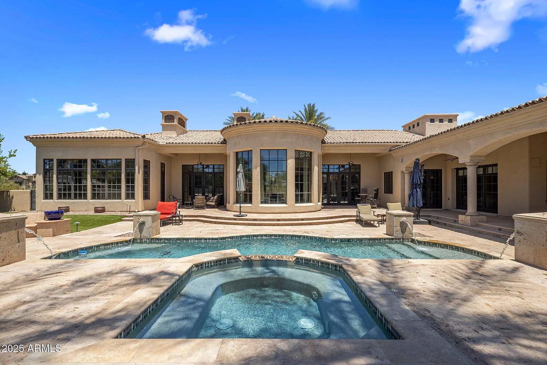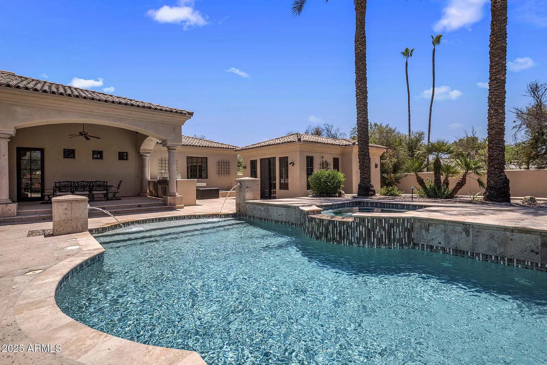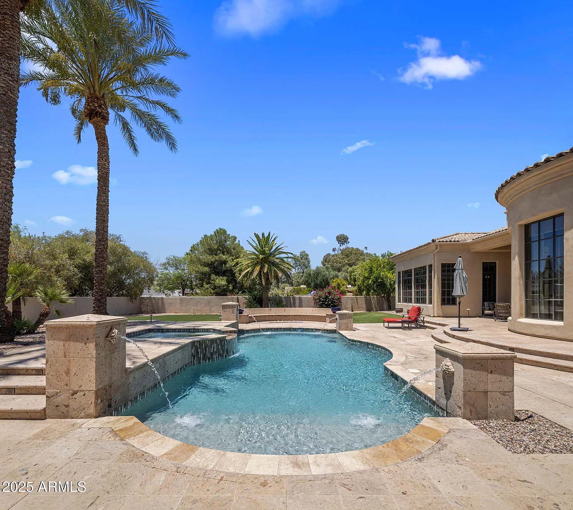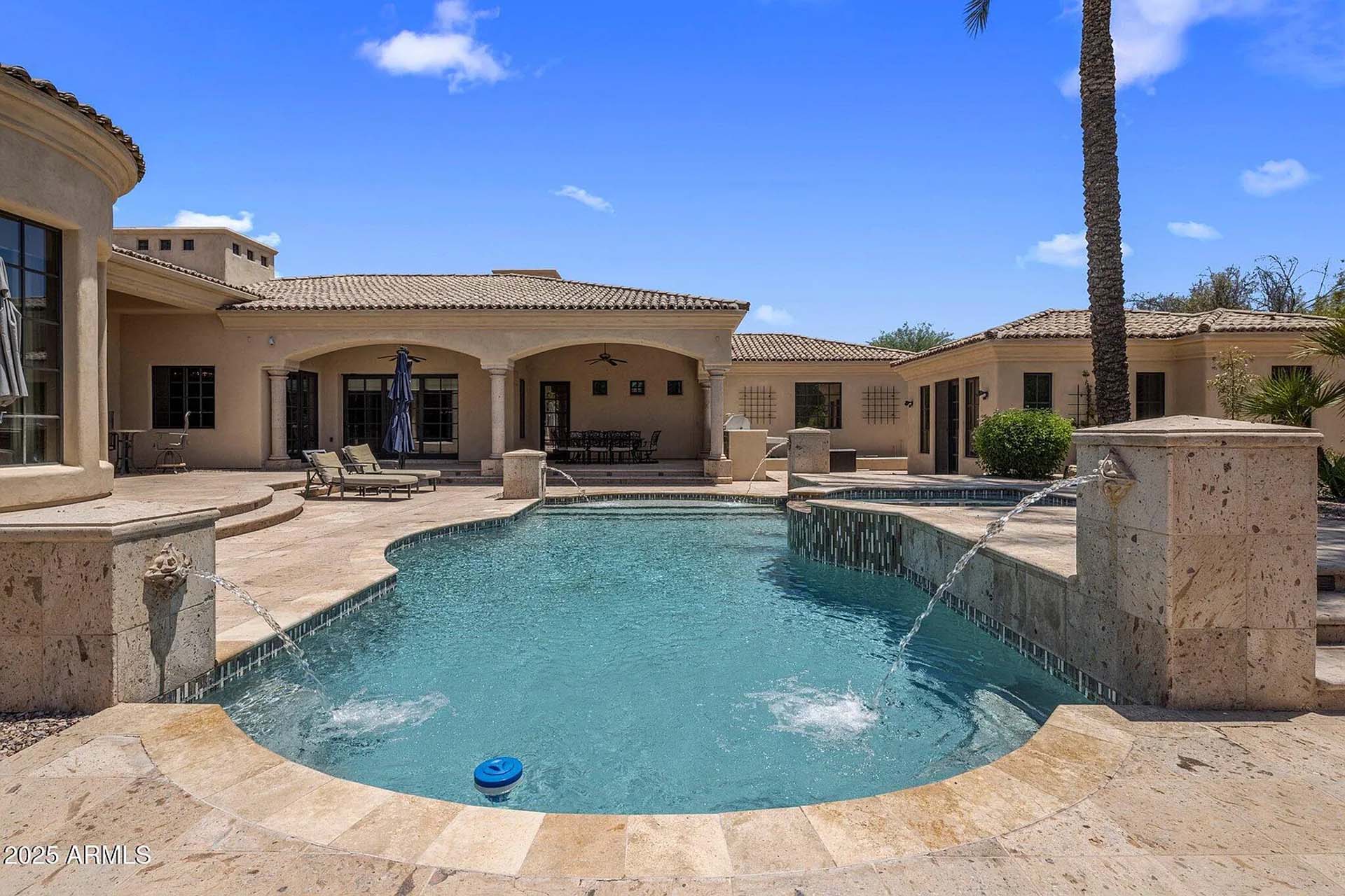 Luxury in abound in this stunning Paradise Valley Estate. This beautiful home has a split floor plan with Master Suite and Large Office off the west wing and 3 en-suites and bonus/game room off the east wing and a detached guest casita by the pool. As you enter into the grand foyer you experience the vastness of the formal living room, dining room and wet bar w/ a 1000 bottle chilled wine cellar. The chef's kitchen is adorned with 4 Viking ovens(2 are wall ovens), Viking range, dual refrigerator/freezers, dual dish washers, 2 islands, vented hood, built in Miele expresso maker, farm sink, drawer microwave, butler and walk-in pantries. The large Master Retreat boast a sitting room, a door leading out to rear yard pool/spa, gas fireplace, 2 walk-in closets with one plumbed for washer/dryer The Master Bath is your personal spa with 2 vanities, 2 water closets, steam shower with rain head, and amazing 2 person jetted tub over looking an atrium. The home is equipped with a Crestron system that works the lights, pool equipment, exterior shades, commercial grade misters ect... The family room is open to kitchen with a automated large exterior pocket door that opens to the covered patio and out door kitchen. The resort style back yard has a custom pool and spa with travertine pavers and many water features. The 1 room guest casita has a full bath with separate entrance to be used as a pool bath. Behind that is an outdoor shower. There is a built-in curved seating area around the gas fire pit. There is a gated entry into the motor court area that is large enough to store an RV. The side entry air conditioned 4 car garage has high ceiling that could accommodate car lifts. There are 2 Electrical Vehicle charging points in the garage as well. In the past 6 years turf has been installed in the front and rear yards and all of the HVAC units including the wine cellar have been replaced. They have also installed 2 tankless water heaters in the main house. The home has enterprise-grade wireless network. This super unique estate is a must see!!