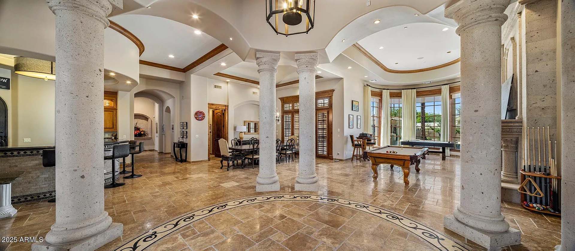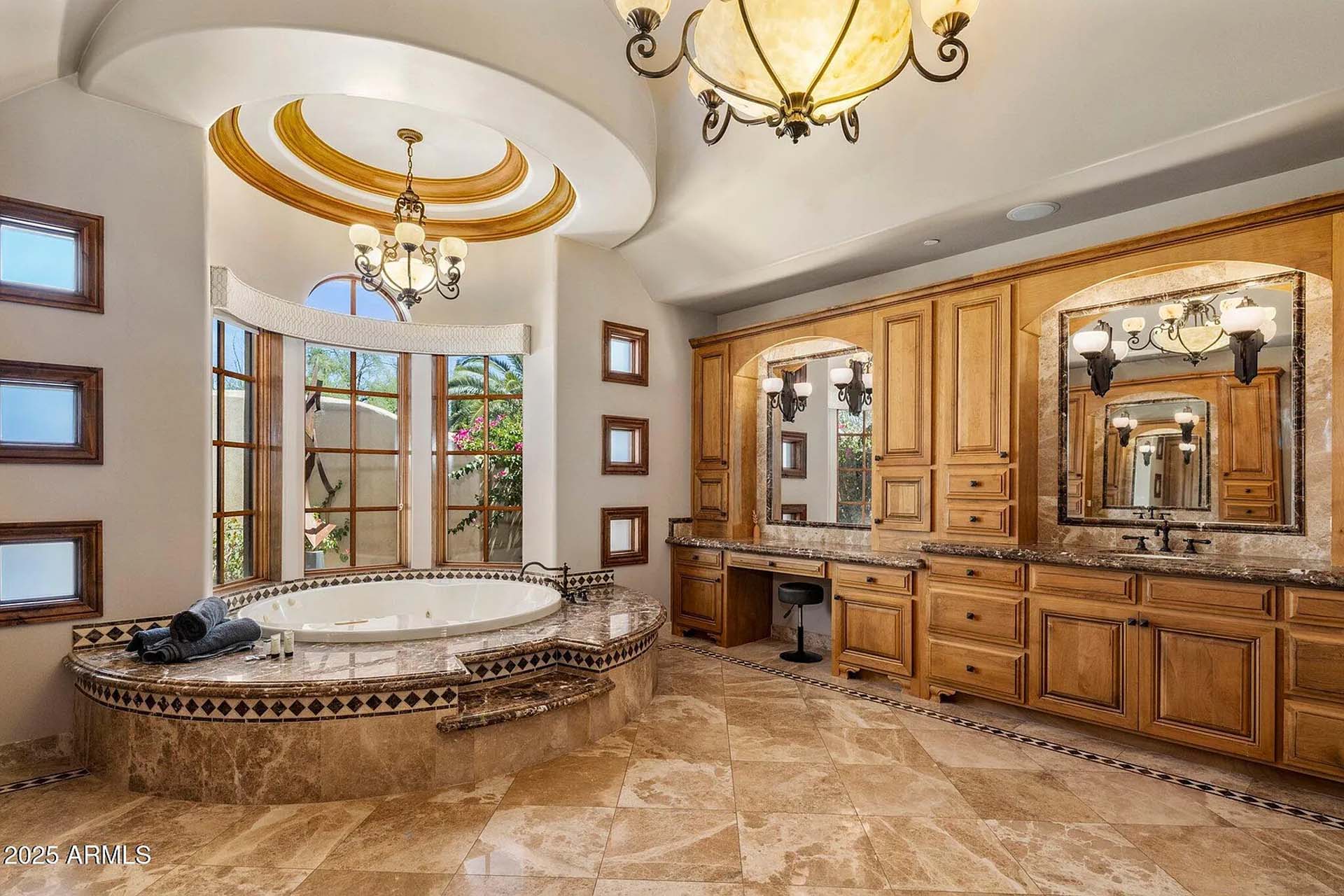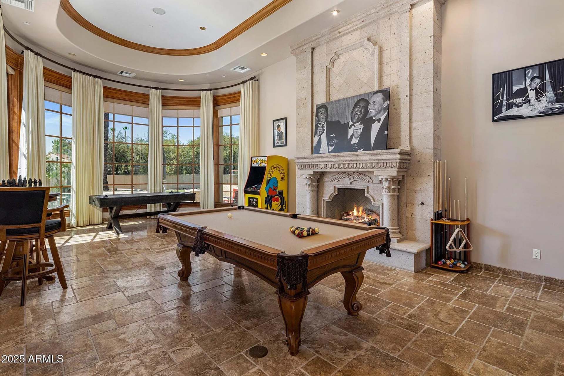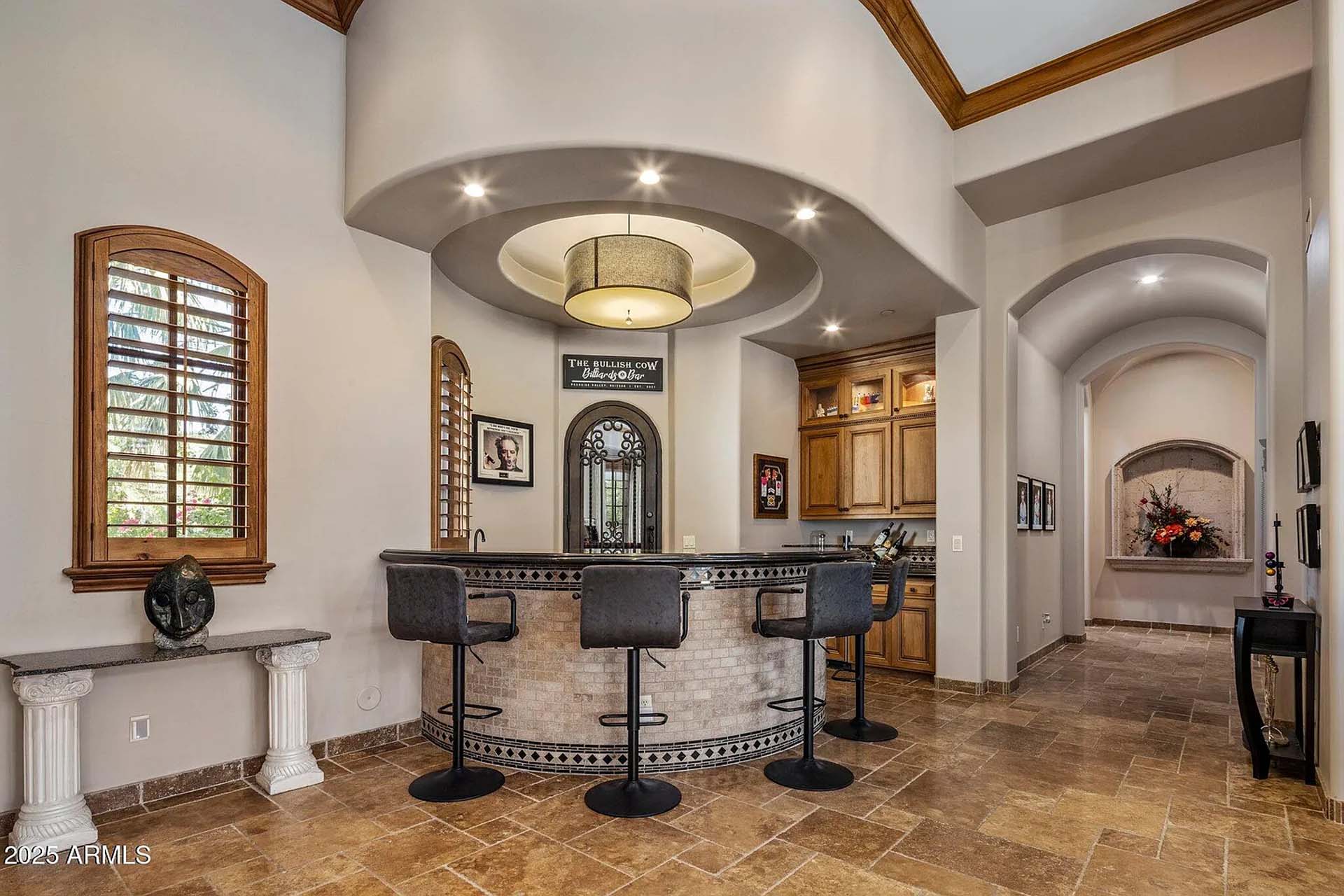 Luxury in abound in this stunning Paradise Valley Estate. This beautiful home has a split floor plan with Master Suite and Large Office off the west wing and 3 en-suites and bonus/game room off the east wing and a detached guest casita by the pool. As you enter into the grand foyer you experience the vastness of the formal living room, dining room and wet bar w/ a 1000 bottle chilled wine cellar. The chef's kitchen is adorned with 4 Viking ovens(2 are wall ovens), Viking range, dual refrigerator/freezers, dual dish washers, 2 islands, vented hood, built in Miele expresso maker, farm sink, drawer microwave, butler and walk-in pantries. The large Master Retreat boast a sitting room, a door leading out to rear yard pool/spa, gas fireplace, 2 walk-in closets with one plumbed for washer/dryer The Master Bath is your personal spa with 2 vanities, 2 water closets, steam shower with rain head, and amazing 2 person jetted tub over looking an atrium. The home is equipped with a Crestron system that works the lights, pool equipment, exterior shades, commercial grade misters ect... The family room is open to kitchen with a automated large exterior pocket door that opens to the covered patio and out door kitchen. The resort style back yard has a custom pool and spa with travertine pavers and many water features. The 1 room guest casita has a full bath with separate entrance to be used as a pool bath. Behind that is an outdoor shower. There is a built-in curved seating area around the gas fire pit. There is a gated entry into the motor court area that is large enough to store an RV. The side entry air conditioned 4 car garage has high ceiling that could accommodate car lifts. There are 2 Electrical Vehicle charging points in the garage as well. In the past 6 years turf has been installed in the front and rear yards and all of the HVAC units including the wine cellar have been replaced. They have also installed 2 tankless water heaters in the main house. The home has enterprise-grade wireless network. This super unique estate is a must see!!